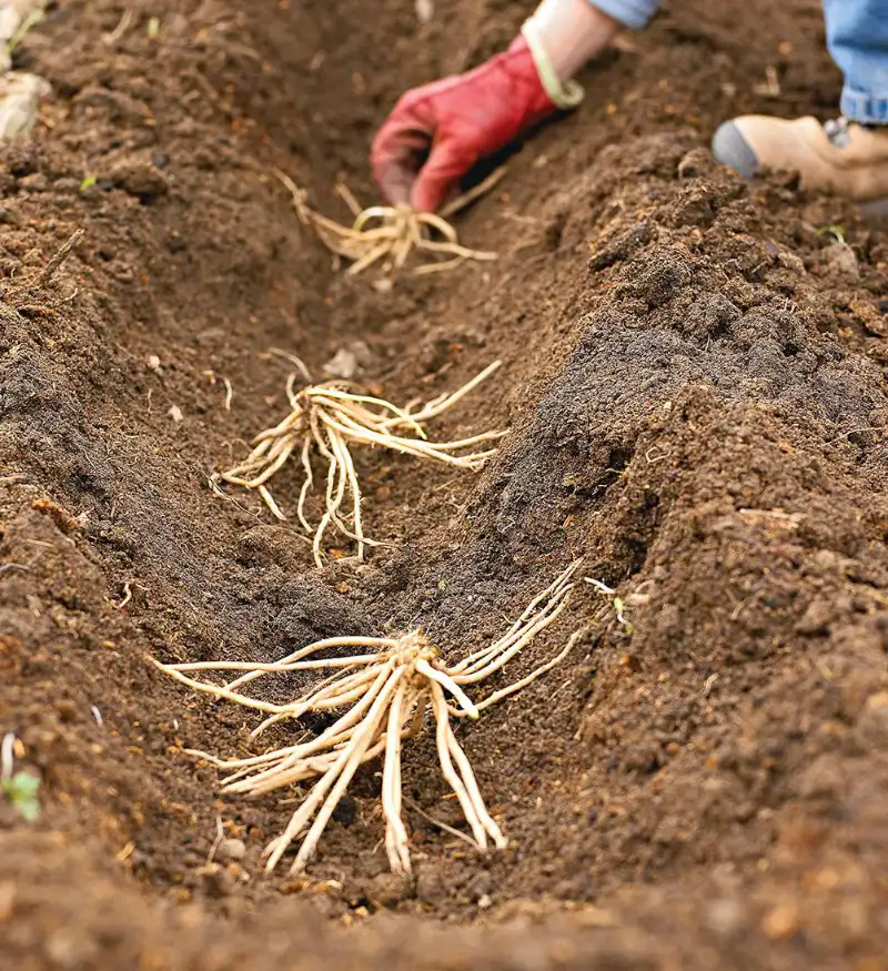 Asparagus plants are perennial which means they crop year after year without needing to be replanted, so it’s well worth investing time preparing a bed of well-drained, compost-rich soil in advance of planting. Choose a sunny location. Raised beds are ideal if your soil is heavy or wet. Asparagus crowns are available in garden centres from late winter.